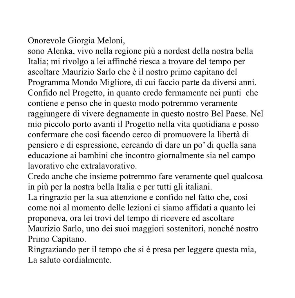 Per aderire all’iniziativa, vi invitiamo a scrivere un vostro pensiero indirizzato alla Presidente del Consiglio, On. Giorgia Meloni, seguendo l’esempio della lettera di Giuliana Comotto. La lettera potrà essere inviata:
